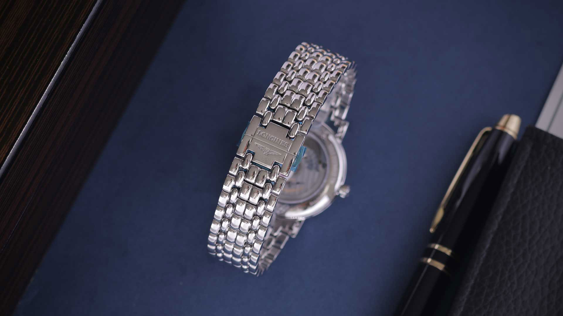 ✓ Dây đeo thép thiết kế hạt gạo được phủ satin sáng bóng đặc trưng thương hiệu Longines.