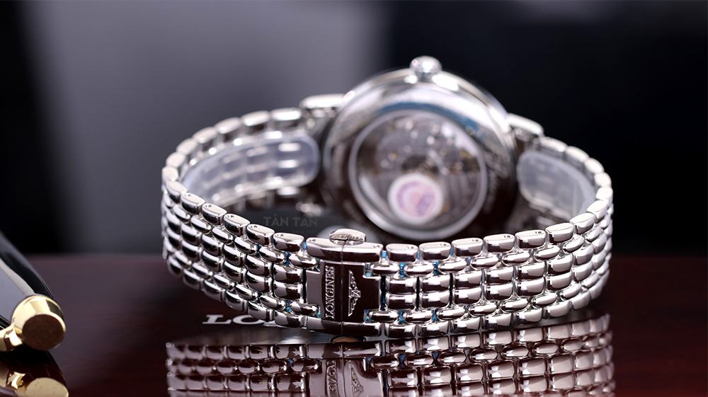 ✓ Dây đeo thép thiết kế hạt gạo được phủ satin sáng bóng đặc trưng thương hiệu Longines.