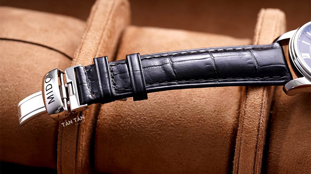 Đi kèm với dây đeo là bộ khóa cài làm bằng thép không gỉ sang trọng. Đây là loại khóa thường sử dụng trên những mẫu dây da cao cấp, giúp cân bằng và chống gãy hoặc hư dây. Trên bề mặt khóa còn được in chìm logo Mido và tên bộ sưu tập Baroncelli tinh tế, khẳng định dấu ấn thương hiệu. Mẫu khóa này có thể tháo ra - mang vào một cách nhanh chóng và tiện lợi, chắc chắn trên cổ tay.