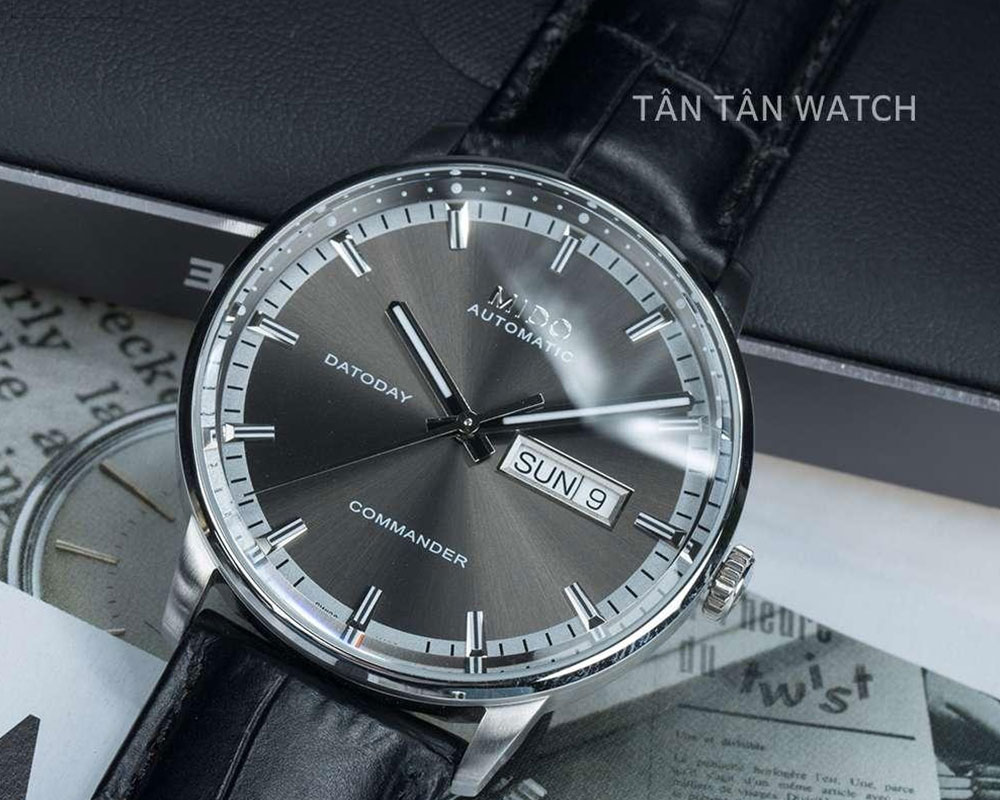 Mặt số đồng hồ Mido M016.430.16.061.22 được thiết kế theo tông màu xám rất quyền lực và sang trọng. Nền mặt số Sunray với những đường nét sáng bóng tỏa ra bên ngoài tựa như ánh dương rực rỡ. Với cách hoàn thiện này giúp cho mặt số Mido M016.430.16.061.22 chuyển đổi màu dưới nhiều góc độ ánh sáng khác nhau, mang đến trải nghiệm quan sát thú vị. Tại góc 12 giờ là logo thương hiệu Mido được khắc chìm sắc nét.