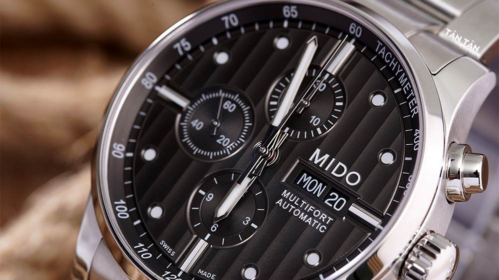 Trên nền mặt số là 3 mặt số phụ với 3 thang đo lần lượt là: bấm giờ chronograph 30 phút, ô tính giây chính 60 giây, ô tính 12 giờ và thang đo tốc độ Tachymeter với giới hạn tối đa lên đến 400 km hiển thị bên ngoài. Các ô phụ chức năng này được sắp xếp cân đối và khắc chìm với các họa tiết vòng tròn đồng tâm mang đến sự nổi bật và độc đáo trên mặt số. Ô lịch ngày, thứ được đặt gọn gàng tại vị trí 3 giờ giúp người đeo dễ dàng quản lý lịch trình. Logo Mido và kí hiệu bộ máy Automatic được đặt đối xứng qua ô lịch ngày khẳng định dấu ấn thương hiệu. Tất cả các chi tiết sắp xếp khoa học cân đối thể hiện đặc trưng của một mặt số đồng hồ thể thao.
