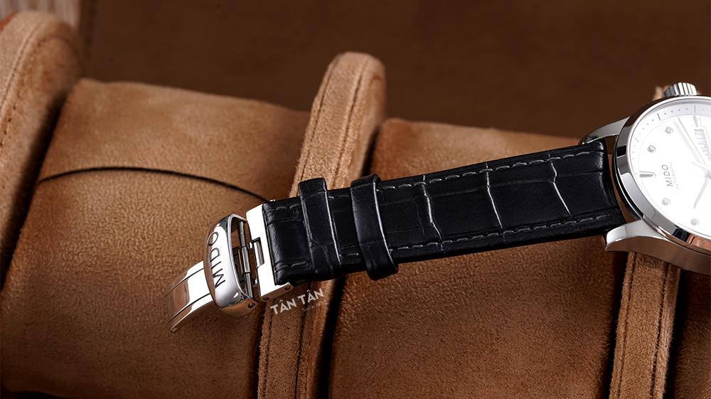 Điểm nhấn của dây đeo là phần khóa cài bằng thép không gỉ sáng bóng. Đây là loại khóa thường sử dụng trên những mẫu dây da cao cấp, với phần gập giúp cân bằng và chống gãy hoặc hư dây. Khóa được hoàn thiện tỉ mỉ từng chi tiết, in chìm logo MIDO khẳng định dấu ấn thương hiệu. Đặc biệt, kiểu khóa này có thể tháo ra - mang vào một cách nhanh chóng và tiện lợi, chắc chắn trên cổ tay