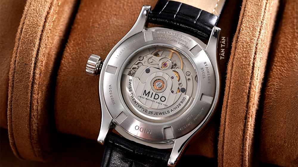 Bên dưới mặt đáy là thiết kế xuyên thấu để lộ “trái tim” của đồng hồ, các quý ông có thể chiêm ngưỡng vẻ đẹp của bộ máy bên trong một cách dễ dàng. Đi kèm là lớp kinh sapphire trong suốt, có độ cứng sau kim cương giúp bảo vệ đồng hồ toàn diện. Nhìn qua có thể thấy Mido rất tỉ mỉ trong từng chi tiết dù che khuất phía sau với khung vỏ chải xước tròn và các bánh răng cân bằng hoàn thiện cao mang đến nét thẩm mỹ cao cho chiếc đồng hồ cao cấp này. Ngoài ra, núm chỉnh giờ màu bạc được đặt ở vị trí 3 giờ rất tiện lợi. Phần núm vặn được thiết kế dạng nắp chai tròn với các vân dọc thân để người dùng dễ dàng điều chỉnh khi sử dụng.