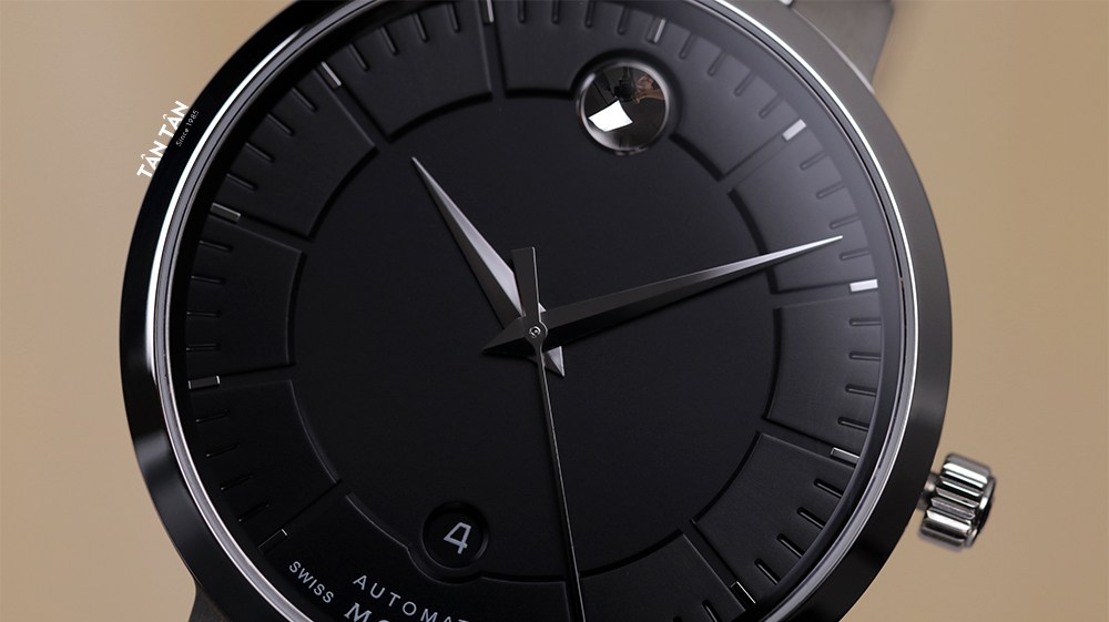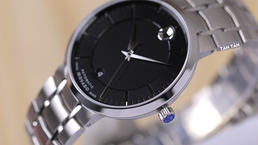 Điểm nổi bật nhất của chiếc đồng hồ mang thương hiệu này là chấm tròn đặc trưng được xuất phát từ hình ảnh mặt trời được đặt ở ngay chính giữa trung tâm 12h. Chấm tròn được đánh sáng bóng, phản chiếu như một chiếc gương nhỏ vừa tinh tế vừa thể hiện trình chế tác của hãng Movado. Ngoài ra, ở vị trí góc 6h là chức năng lịch ngày được đặt trong ô tròn nhỏ, cùng nằm trên viền tròn đối xứng với chấm tròn đặc trưng như sự chuyển động của các hành tinh.