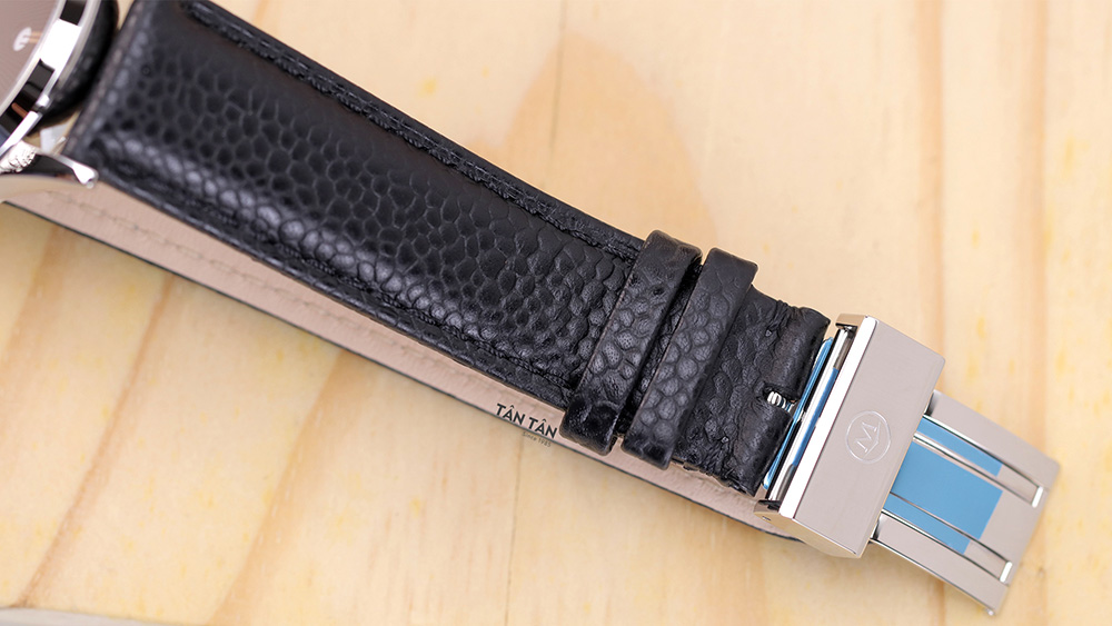 Dây đeo sử dụng khóa gập kim loại sáng bóng có in logo thương hiệu mang lại cảm giác gập mở dễ dàng, hạn chế gãy dây da và chắc chắc trên tay người đeo.