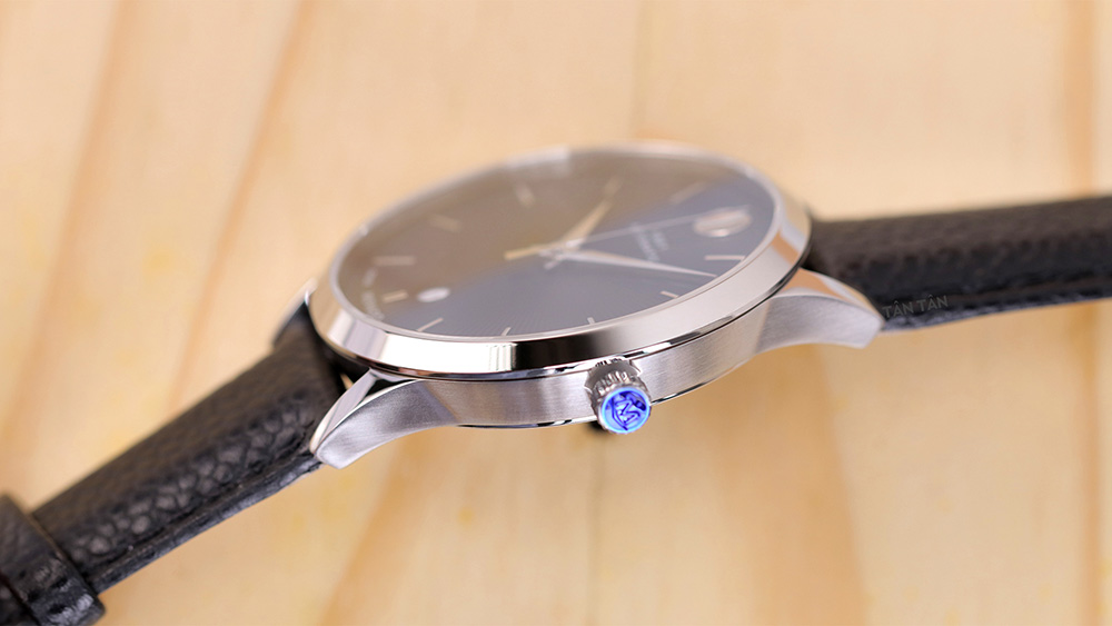 Mặt số hoàn thiện vân sunray sắc nét màu xanh dương với chấm tròn, 3 kim dauphine và lịch ngày góc 6 giờ tiện dụng
