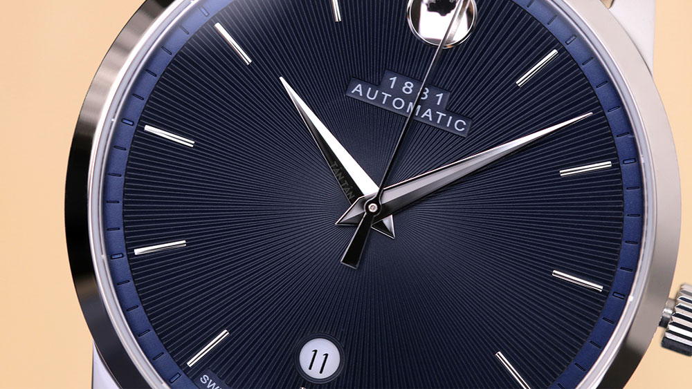✓ Mặt số xanh dương khắc tia Sunburst đồng tâm bắt mắt, cùng chấm tròn độc quyền từ Movado.