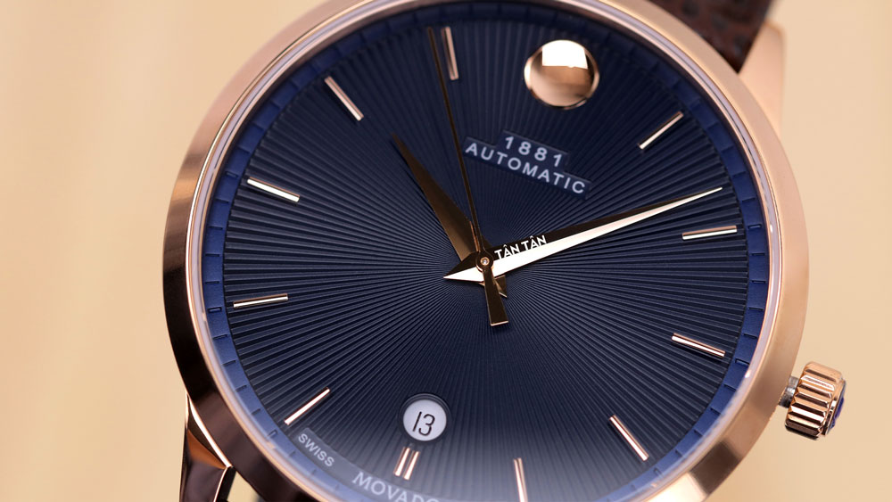 Tại mốc 12 giờ là chấm tròn sáng bóng Signature của Movado đại diện cho mặt trời vào lúc giữa trưa với ánh sáng rực rỡ, cũng là biểu tượng cho trái đất. Chấm tròn này được đánh sáng bóng màu vàng hồng, phản chiếu như một chiếc gương nhỏ thể hiện trình chế tác của hãng Movado. Tại góc 6 giờ là ô lịch ngày hình tròn hiển thị rõ ràng, dễ quan sát và nằm đối xứng với chấm tròn “Signature” như sự chuyển động của các hành tinh. Bên canh đó, tại góc 12h cũng thể hiện tên bộ máy cơ Automatic và năm thành lập 1881. Sát dưới cạnh viền là tên thương hiệu Movado chuẩn Swiss Made, khẳng định chất lượng đồng hồ Movado Thụy Sĩ.