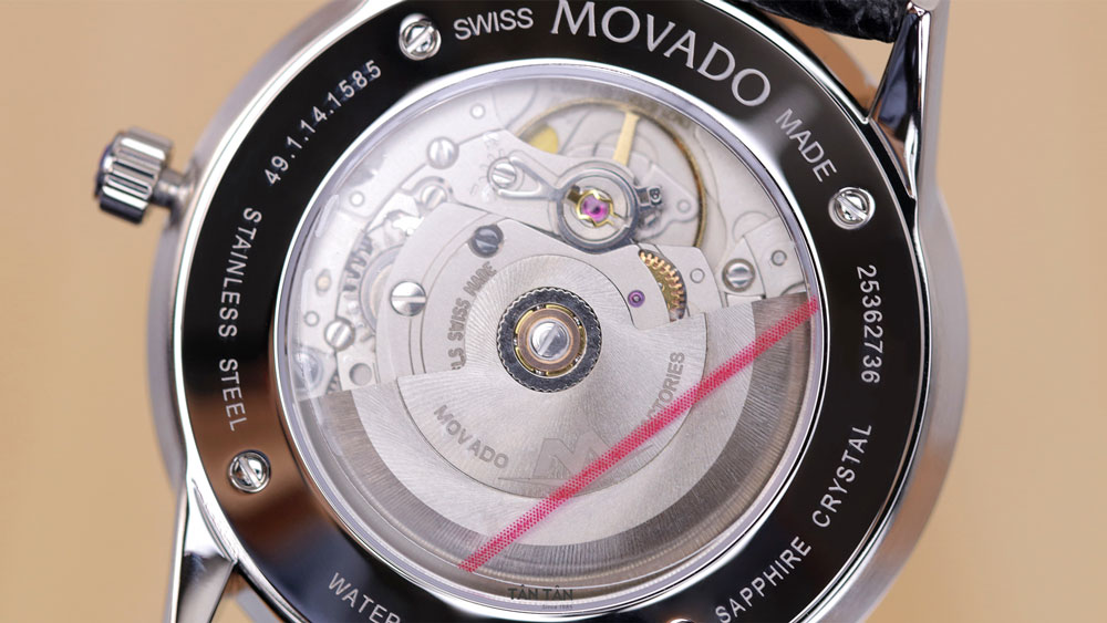 Những bộ máy đồng hồ Movado cơ đến được lắp ráp tại Thụy Sĩ luôn đảm bảo sự vượt trội từ xưa đến nay, bảo chứng cho đẳng cấp và chất lượng hàng đầu trong ngành công nghiệp đồng hồ. Mặt sau bộ vỏ trong suốt của Movado 0607617 lộ ra bộ máy Automatic có thiết kế tuyệt đẹp với các khung máy, bánh răng đánh phay xước kết hợp phay nhám, thể hiện sự chăm chút của những người thợ đồng hồ Thụy Sĩ.