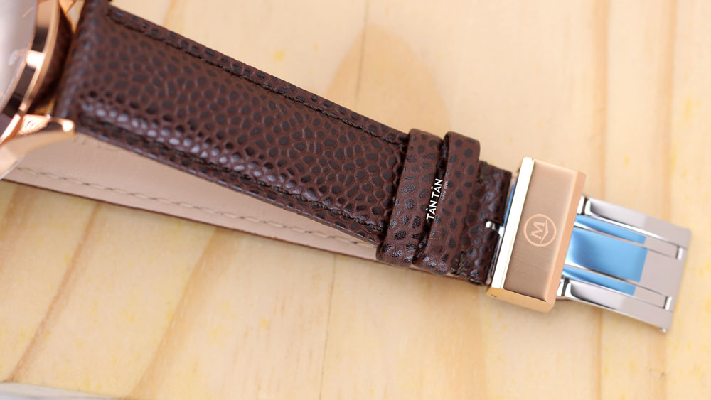 Dây đeo sử dụng khóa cân bằng sáng bóng có in logo thương hiệu mang lại cảm giác gập mở dễ dàng, hạn chế gãy dây da và chắc chắc trên tay người đeo.