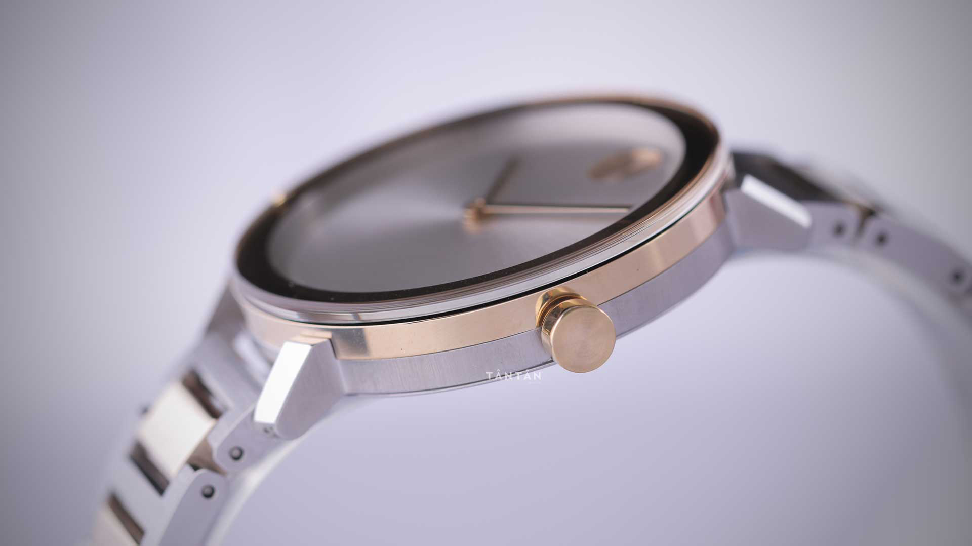 Bộ vỏ đồng hồ được Movado sử dụng các chất liệu cao cấp như thép không gỉ 316L chống va đập, hạn chế trầy xước tốt. Vỏ được hoàn thiện phay xước kết hợp viền bezel sáng bóng màu vàng gold ôm lấy tấm kính khoáng K1 thiết kế tràn viền bên trên, giúp bảo vệ mặt số tốt hơn, đồng thời gợi lên sự trẻ trung phóng khoáng.