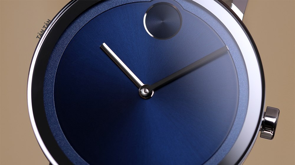 Thiết kế tinh giản tối đa không cọc số và chi tiết 1 chấm 2 kim mang tính nhận diện thương hiệu cao. Chấm tròn thương hiệu tại vị trí 12 giờ được hoàn thiện vân tròn đồng tâm viền thép ánh bạc nổi bật với bộ 2 kim baton đơn giản hài hòa. Sự vắng mặt của kim giây giúp mặt số như ngưng đọng bởi sự dịch chuyển vô cùng khẽ khàng của bộ đôi kim chính. Ngoài ra, thông tin thương hiệu Movado chuẩn Swiss Made được thể hiện nhỏ gọn tại vị trí 6 giờ, khiêm tốn và nhã nhặn nhưng vẫn khẳng định được giá trị đến từ thương hiệu lớn.