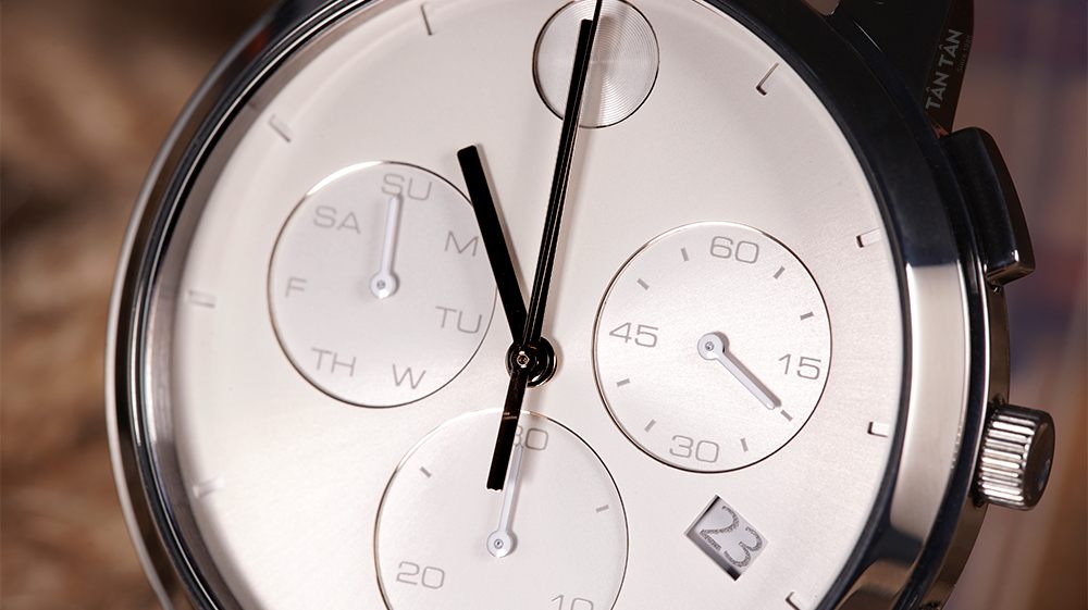 Mặt số màu trắng vân sunray thanh lịch với 3 mặt số phụ chuẩn phong cách thể thao, năng động