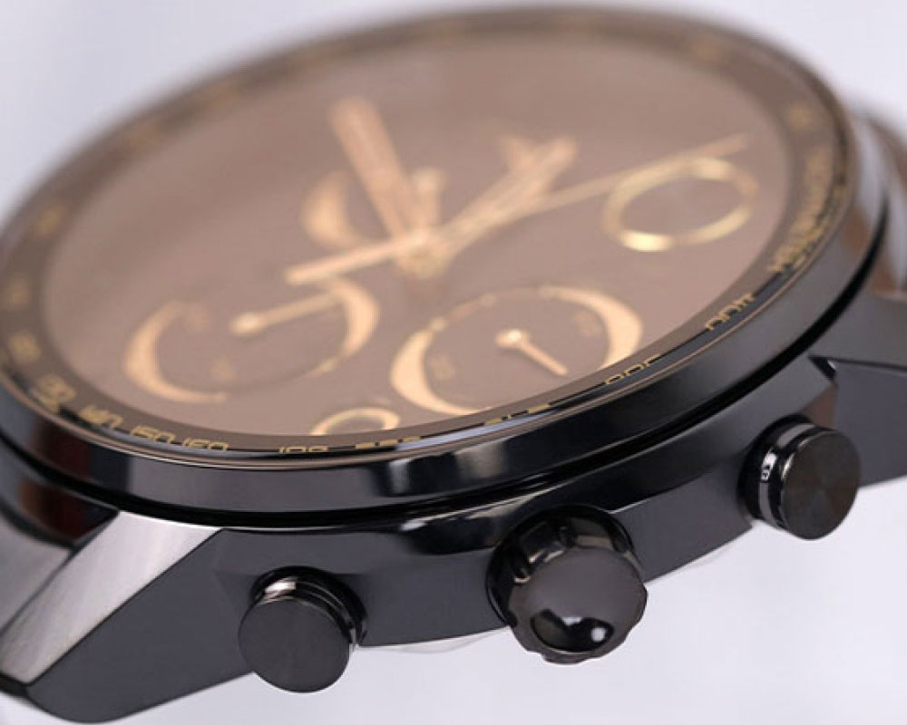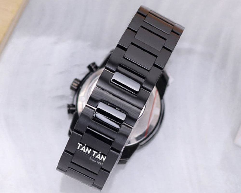 Dây đeo cũng được mạ ion màu đen, phần bề mặt dây được làm phẳng với những mắt dây to dạng H-Link nối với nhau chắc chắn. Mặt trước của bảng dây hoàn thiện với phay xước, khi nghiêng đồng hồ theo góc sáng bộ dây sẽ phản chiếu lại ánh sáng rất đẹp mắt. Sử dụng khóa bướm tiện lợi và thẩm mỹ đi kèm dây đeo, phần khóa cong hai bên giúp cố định mặt số đồng hồ không bị dịch chuyển khỏi vị trí ban đầu trên cổ tay tạo cảm giác chắc chắn ôm trọn cổ tay giúp cho người đeo tự tin vận động thoải mái.