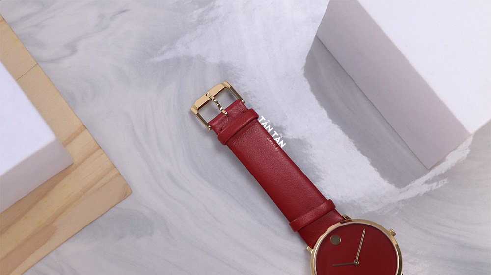 Đi cùng là dây da chính hãng cao cấp màu đỏ có độ dẻo dai và chịu nước cực cao, thoáng khí, không gây bí da khi đeo lên tay. Đặc biệt sử dụng 100% da thật để làm dây đeo nên rất nhẹ, bền màu và không dễ bong tróc. Với tông màu đỏ đặc sắc, chiếc đồng hồ sẽ góp phần tô điểm thêm sự phá cách và độc đáo trong những trang phục giàu tính nghệ thuật. Kèm theo dây da là khóa cài đơn giản được mạ PVD màu vàng ton sur ton với bộ vỏ đồng hồ, dễ dàng đeo vào-tháo ra giúp ôm trọn cổ tay mang lại cảm giác mềm mại và chắc chắn khi đeo trên tay.