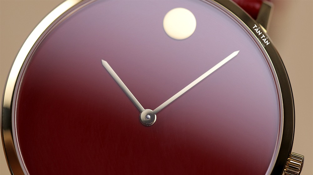 Chấm tròn “signature” độc quyền đặt tại góc 12h quen thuộc giúp nhận dạng thương hiệu Movado được thể hiện nổi bật trên nền đỏ của mặt số. Chấm tròn này được mạ màu vàng gold óng ánh và lấy cảm hứng từ hình ảnh mặt trời lên thiên đỉnh vào buổi ban trưa. Đối xứng với logo thương hiệu ở dưới góc 6h là dòng chữ in nổi và sắc nét “MOVADO” chuẩn Swiss Made màu vàng gold hài hòa với tổng thể, lưu giữ nét đặc trưng độc quyền cùng chất lượng vượt trội của thương hiệu lừng danh Thụy Sĩ.
