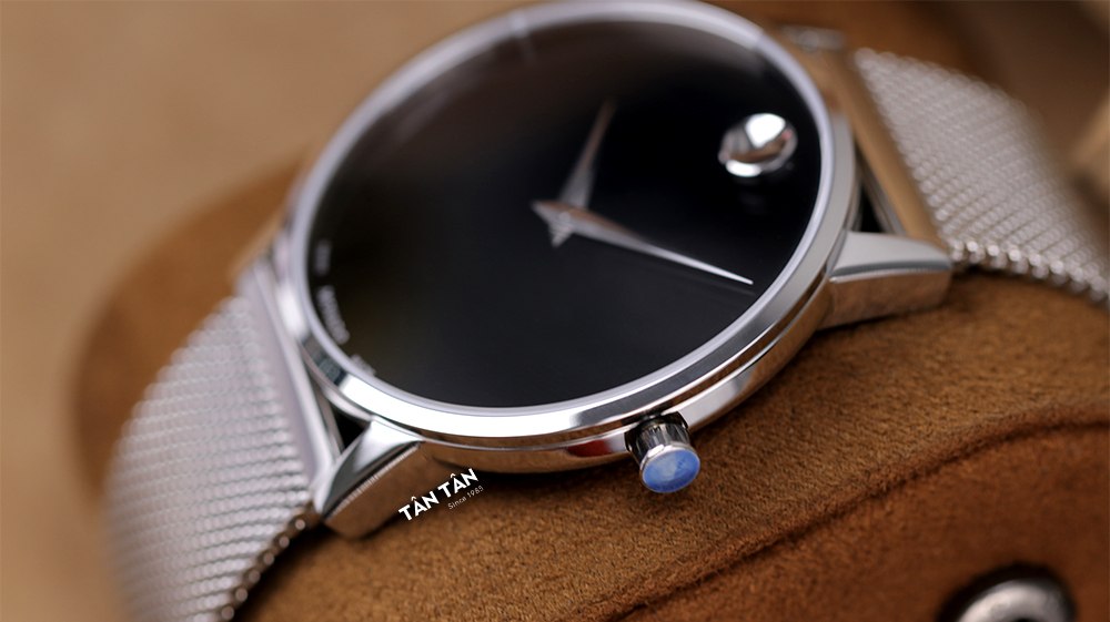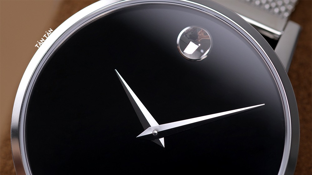 Điểm làm nên dấu ấn của Movado chính là mặt số rất ít xuất hiện các chi tiết như cọc số hay vạch chia phút mà tất cả những gì nó thể hiện chỉ là 2 kim và 1 chấm kim loại tròn ở góc 12 giờ. Chấm tròn sáng bóng, tỏa sáng như mặt trăng trên bầu trời đêm mặt số, làm nổi bật bộ kim dauphine được chế tác tinh xảo, đánh bóng tỉ mỉ tạo cảm giác “dễ chịu” và hài hòa với tổng thể thiết kế của đồng hồ. Sự vắng mặt của kim giây, mặt số thông thoáng này gần như ngưng đọng bởi sự chuyển động vô cùng khẽ khàng của bộ 2 kim chính đồng hồ.