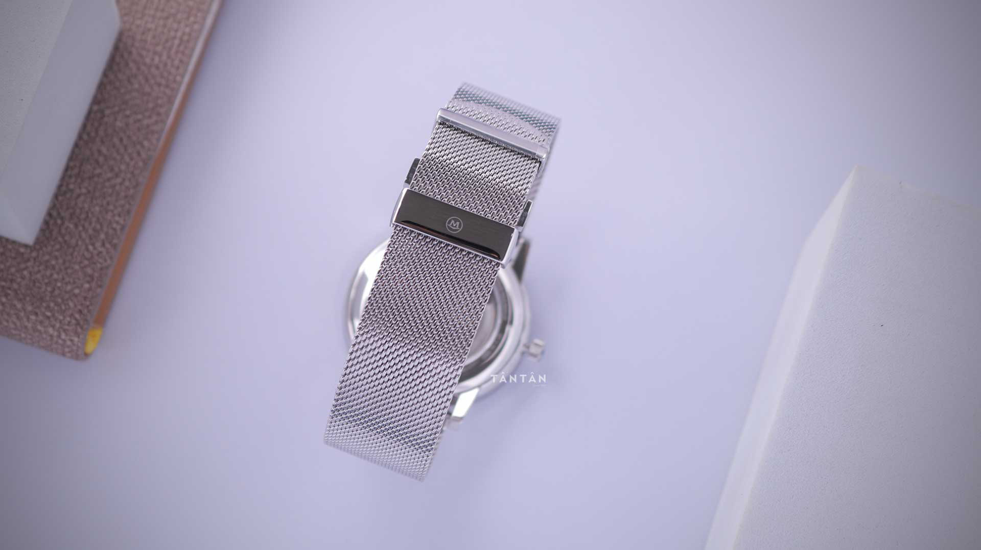 Dây đeo có độ rộng 20mm rất hài hòa với kích thước cổ tay của các chàng trai Việt. Kết hợp cùng với dây đeo linh hoạt là khóa gập vô cùng tiện lợi. Trên bề mặt của khóa gài là logo Movado được in mờ cực kỳ tinh tế.