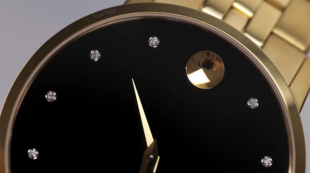 Tạo điểm nhấn nổi bật trên mặt số chính là 11 viên kim cương có tổng khối lượng 0.043 carat đạt tiêu chuẩn đá quý SI, được đính ngay tại vị trí các mốc giờ giúp cho người đeo có thể dễ dàng nhận diện được thời gian. Riêng vị trí 12 giờ được nhường chỗ lại cho chấm tròn đặc trưng của hãng Movado. Chấm tròn này được đánh sáng bóng phủ màu vàng như hóa mặt trăng kết hợp với các “ngôi sao” kim cương tỏa sáng trên bầu trời đêm của mặt số.