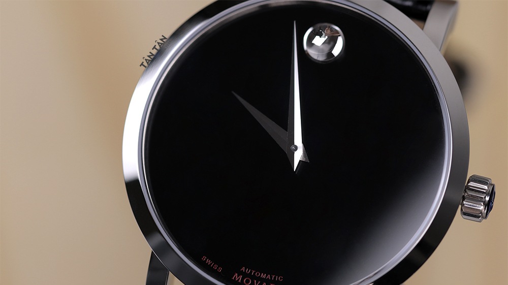 ✓ Mặt số màu đen tuyền mạnh mẽ đậm nét “một chấm hai kim” đặc trưng Movado.
