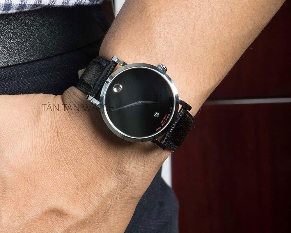 ✓ Mặt số màu đen tuyền mạnh mẽ đậm nét “một chấm hai kim” đặc trưng Movado.