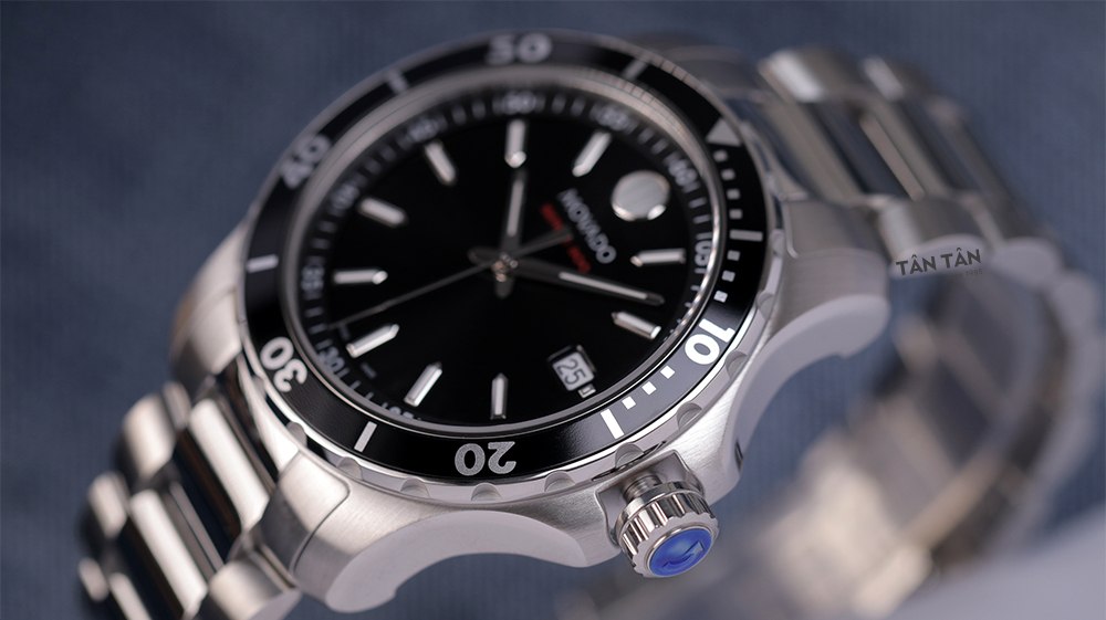 Bên cạnh đó, bộ vỏ Movado 2600135 được làm bằng chất liệu thép không gỉ cao cấp. Đây là loại thép có hàm lượng carbon cực thấp, chống ăn mòn tổng thể tốt hơn trong môi trường nước biển hoặc chất lỏng có tính axit như mồ hôi. Đồng thời, loại thép này vô cùng chắc chắn, có khả năng chống va đập tốt giúp bảo vệ bộ máy bên trong một cách tối ưu nhất. Toàn bộ bộ vỏ này được đánh xước phay theo công nghệ hiện đại, tạo hiệu ứng chuyển sáng bắt mắt vô cùng thu hút. Phía trên là viền bezel xoay đơn hướng hoàn thiện dạng bánh răng với bề mặt nhôm màu đen nổi bật. Đi kèm với bộ vỏ là phần núm chỉnh đồng hồ tại vị trí 3h, phần núm này được thiết kế dạng nắp chai với các vân nổi dọc thân giúp người dùng dễ dàng điều chỉnh giờ.
