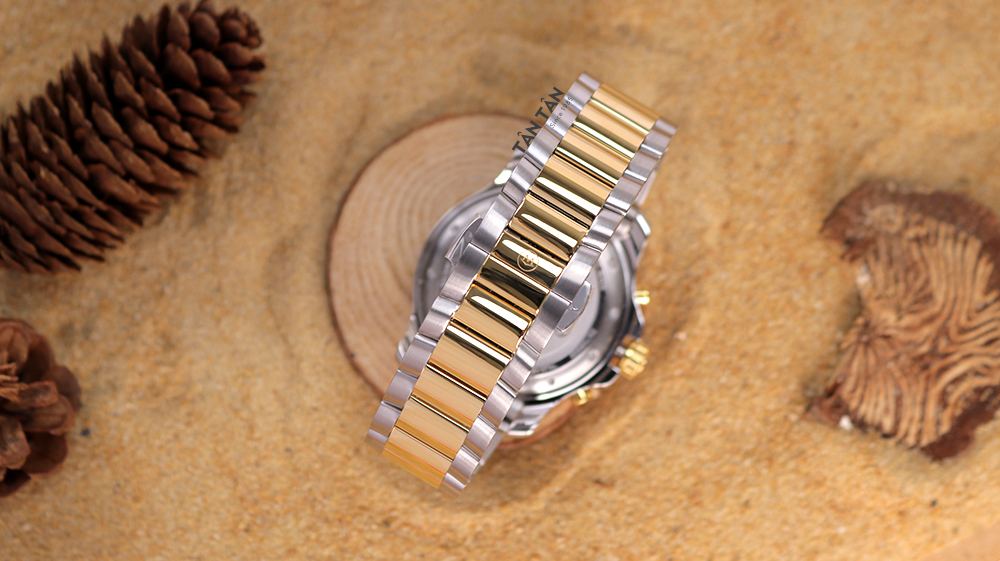 Movado 2600146 còn được trang bị dây đeo bằng thép không gỉ cao cấp với tone màu chủ đạo bạc và vàng gold nổi bật. Dây đeo được thiết kế theo phong cách sang trọng với các mắt xích vàng gold chạy thẳng tạo điểm nhấn độc đáo cho thiết kế. Ngoài ra, phần khóa cân bằng cũng được làm từ thép nguyên khối màu bạc bền chắc được hoàn thiện tỉ mỉ và hài hòa với thiết kế đồng hồ, tạo cảm giác liền mạch và thẩm mỹ cao. Các chàng có thể dễ dàng tháo ra - lắp vào trong quá trình sử dụng.