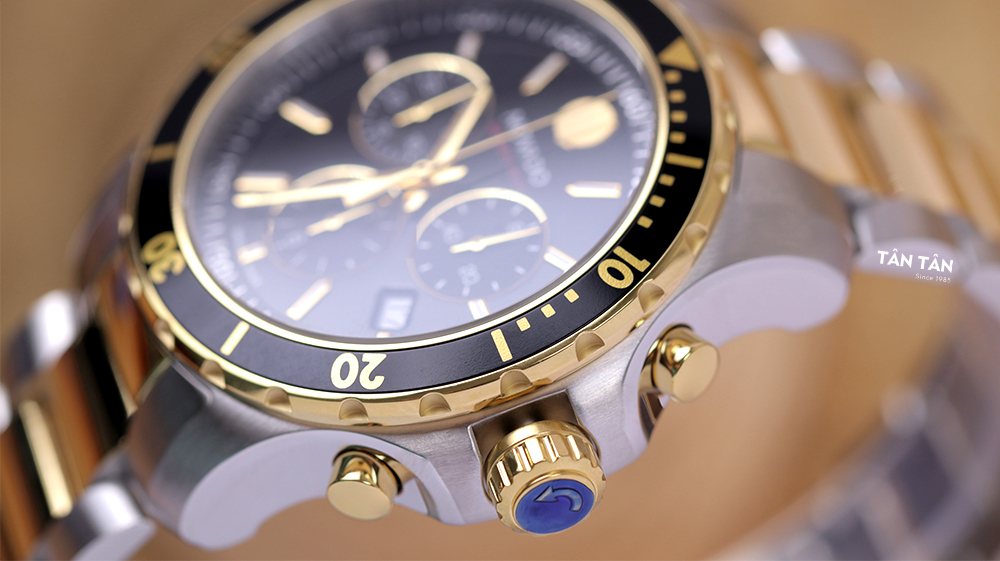 Bộ vỏ thép cứng cáp hoàn thiện phay xước thẩm mỹ điểm xuyết màu vàng gold ở niềng bezel xoay đơn hướng hỗ trợ chức năng lặn
