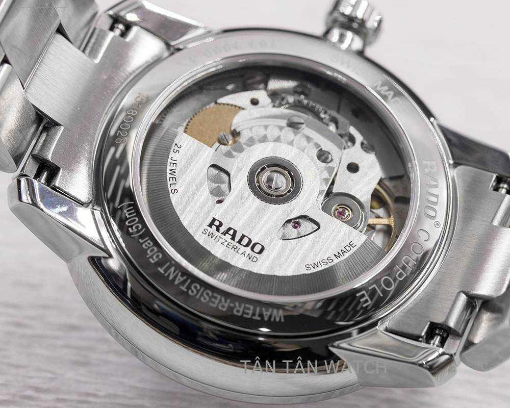 Ẩn bên trong vẻ ngoài sang trọng, thanh lịch là bộ máy cơ Automatic ETA Caliber C07.611 chất lượng Thụy Sĩ được Rado trang bị cho nhiều mẫu đồng hồ cơ Automatic cao cấp của hãng. Bộ máy được hoàn thiện tỉ mỉ bằng kỹ thuật cao, điều chỉnh vị trí và hoạt động của các bánh răng với 25 chân kính, dao động với tần số 21600 nhịp/giờ giúp đồng hồ hoạt động chính xác với thời gian trữ cót lên đến 80 giờ (điều kiện tuyệt đối). Một lưu ý rằng, tùy thuộc vào điều kiện sử dụng khác nhau cùng các yếu tố môi trường, gia công, vận chuyển mà thời gian dự trữ cót thực tế thấp hơn con số nhà sản xuất đưa ra.