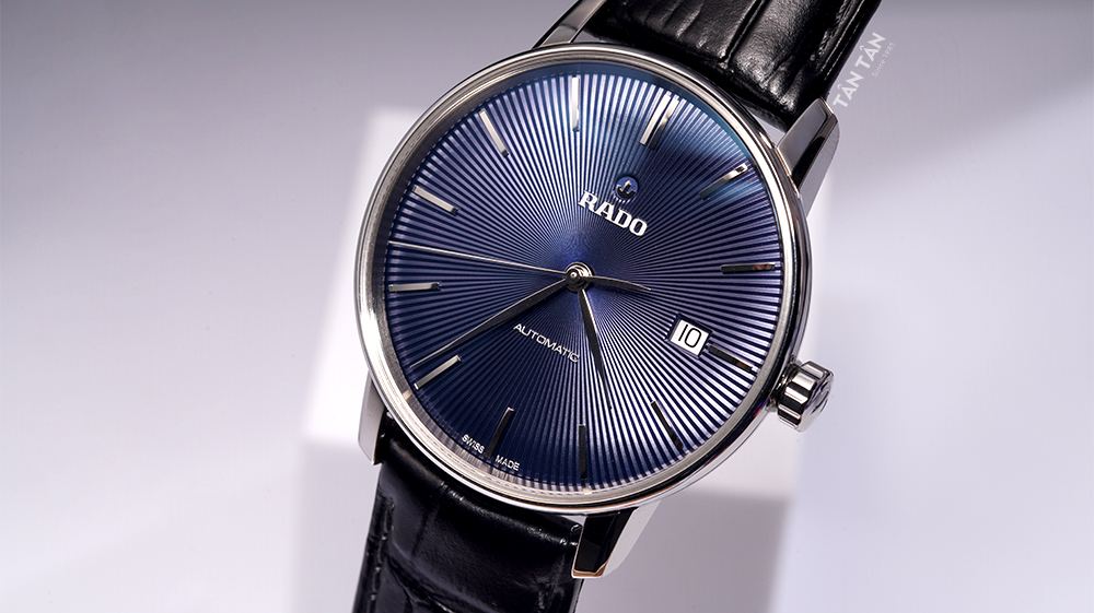 Các cọc số cũng được vát mỏng để hài hòa cùng tổng thể thiết kế. Khi quan sát kỹ hơn, ta sẽ thấy những cọc số kim loại này tuy mỏng nhưng đều được đánh bóng toàn phần. Đây là một chi tiết đắt giá và đầy tinh tế, thể hiện trình độ chế tác bậc thầy của Rado. Tại góc 12 giờ là logo và tên thương hiệu Rado được làm nổi bằng kim loại sáng ton-sur-ton với bộ kim, góc 3 giờ là lịch ngày được đặt gọn gàng mang lại điểm nhấn để mặt số thêm phần cân đối và hài hòa.