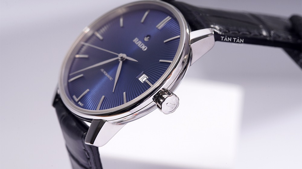 Rado R22860205 sở hữu mặt số đơn giản nhưng thu hút, bắt đầu từ gam màu xanh dương đậm tạo chiều sâu mang lại một nét thanh lịch và nam tính. Như để thể hiện rõ hơn sự độc đáo của đồng hồ, Rado đã hoàn thiện mặt số với vân Sunburst Guilloche khác hẳn với những mặt số thông thường khác. Vân Sunburst Guilloche được khắc tỉ mỉ mang đến độ chìm nổi giống như những nếp gấp thời gian và có độ chuyển màu theo từng góc ánh sáng rất đẹp mắt.