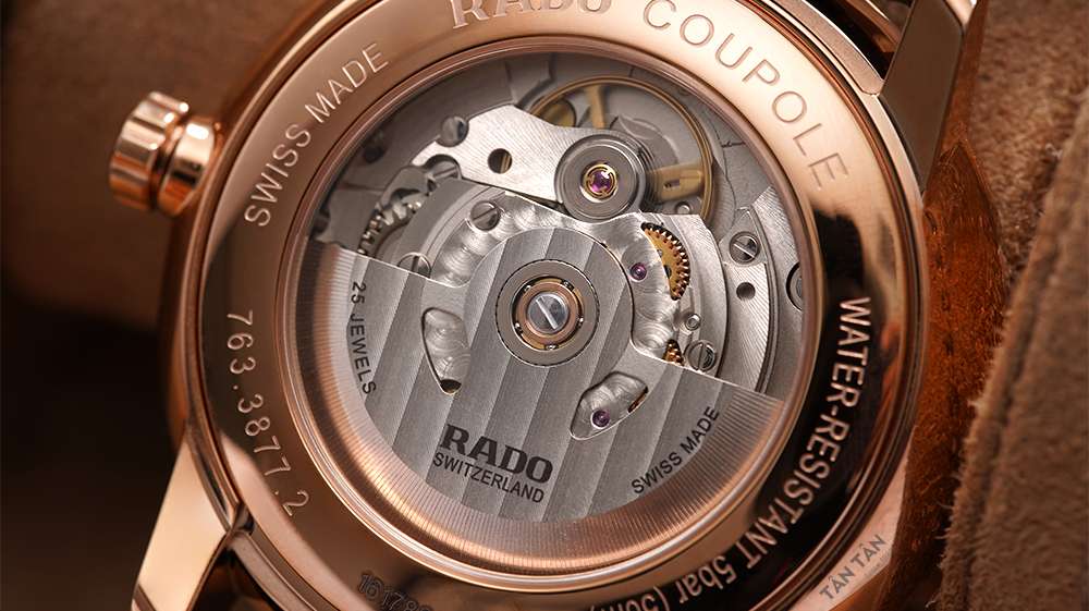 Rado là thương hiệu đồng hồ nổi tiếng nhờ vào kỹ thuật chế tác chất liệu cao cấp với độ bền vượt thời gian cùng thiết kế sáng tạo, độc đáo. Điển hình là bộ sưu tập Rado Coupole Classic với chiếc đồng hồ Rado R22877165 được lấy cảm hứng từ những chiếc đồng hồ Rado cổ. Thiết kế màu nâu đen kết hợp với bộ vỏ vàng hồng toát lên sự sang trọng, vương giả đầy kinh ngạc từ các chi tiết được cắt gọt tỉ mỉ. Đây là mẫu đồng hồ xứng đáng nhận được sự quan tâm của các chàng kể từ khi ra mắt.
