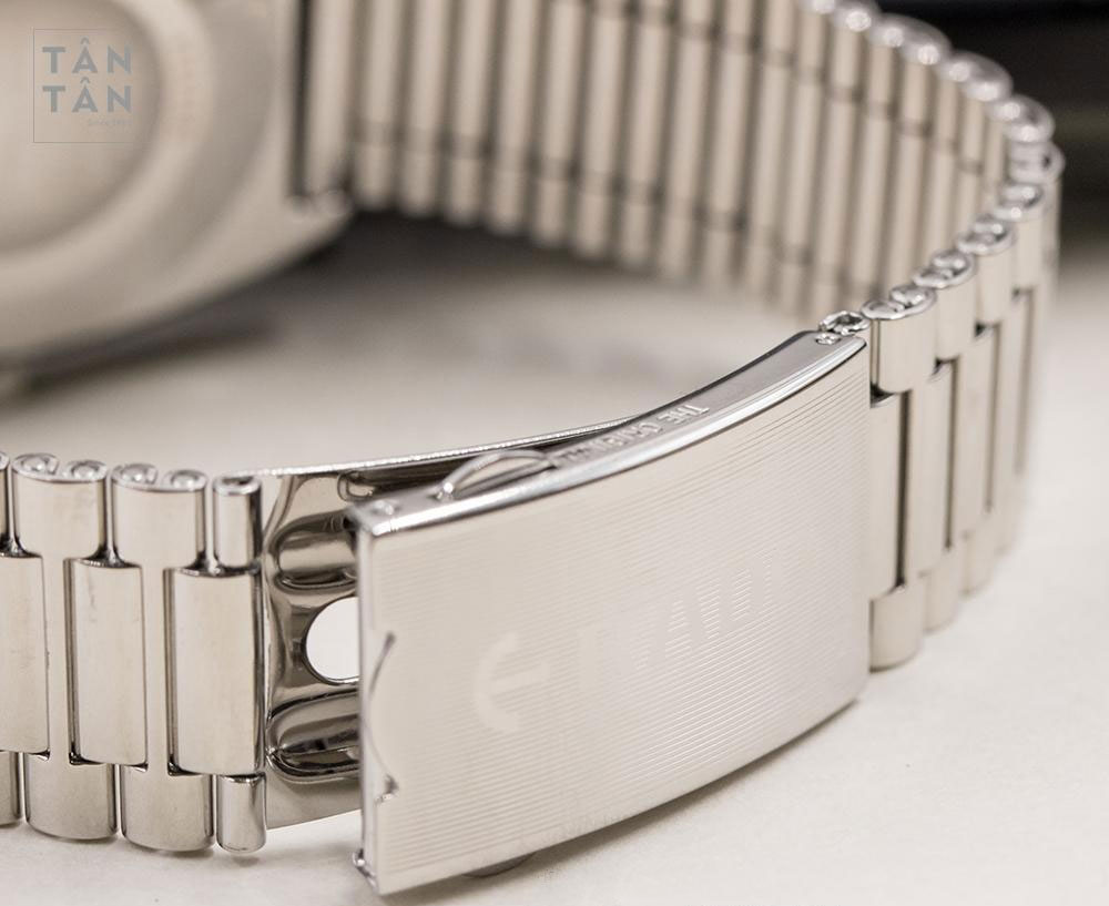 Kết hợp với bộ dây là khóa gập chắc chắn với nút bấm thông minh hỗ trợ dễ dàng đeo vào - tháo ra, giúp đồng hồ ôm trọn cổ tay một cách thoải mái. Thêm vào đó, phía trên bề mặt khóa cũng được chải vân sọc tỉ mỉ và dập logo chìm tinh tế.