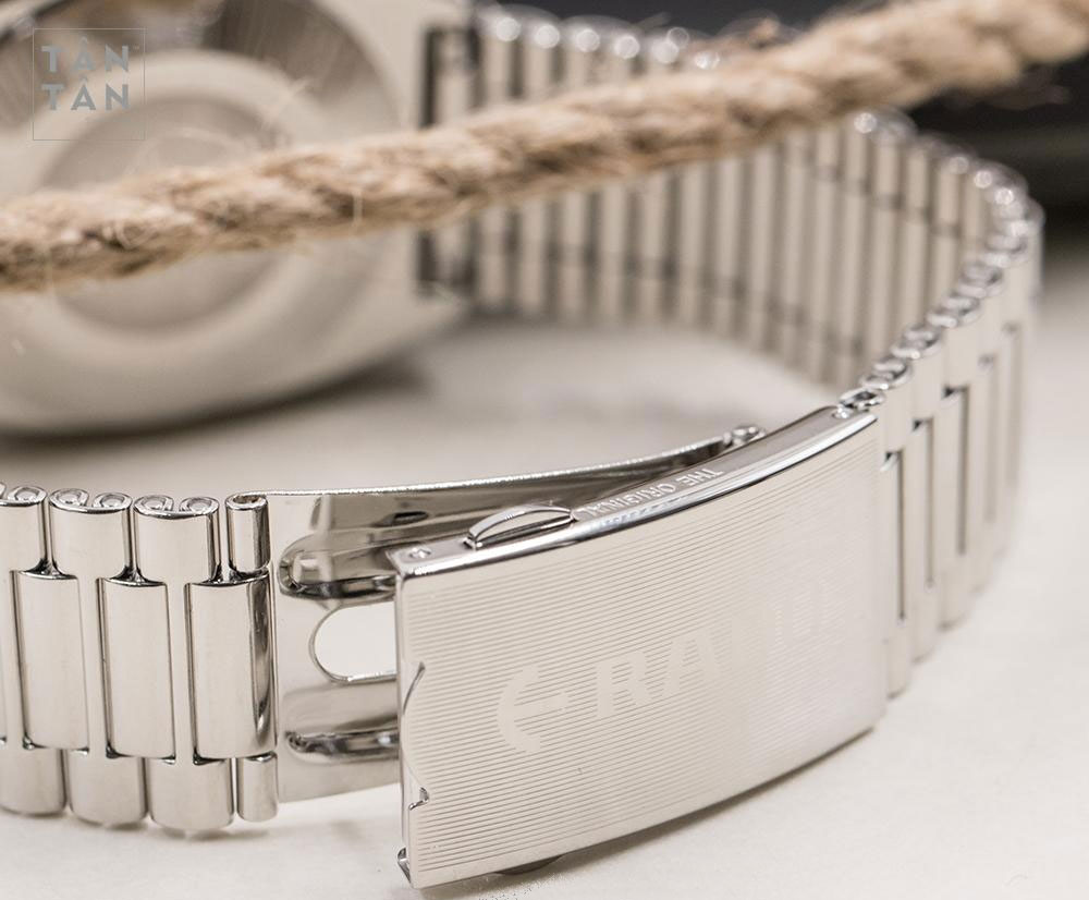 Kết hợp với bộ dây là khóa gập chắc chắn với nút bấm thông minh hỗ trợ dễ dàng đeo vào - tháo ra, giúp đồng hồ ôm trọn cổ tay một cách thoải mái. Thêm vào đó, phía trên bề mặt khóa cũng được chải vân sọc tỉ mỉ và dập logo chìm tinh tế.