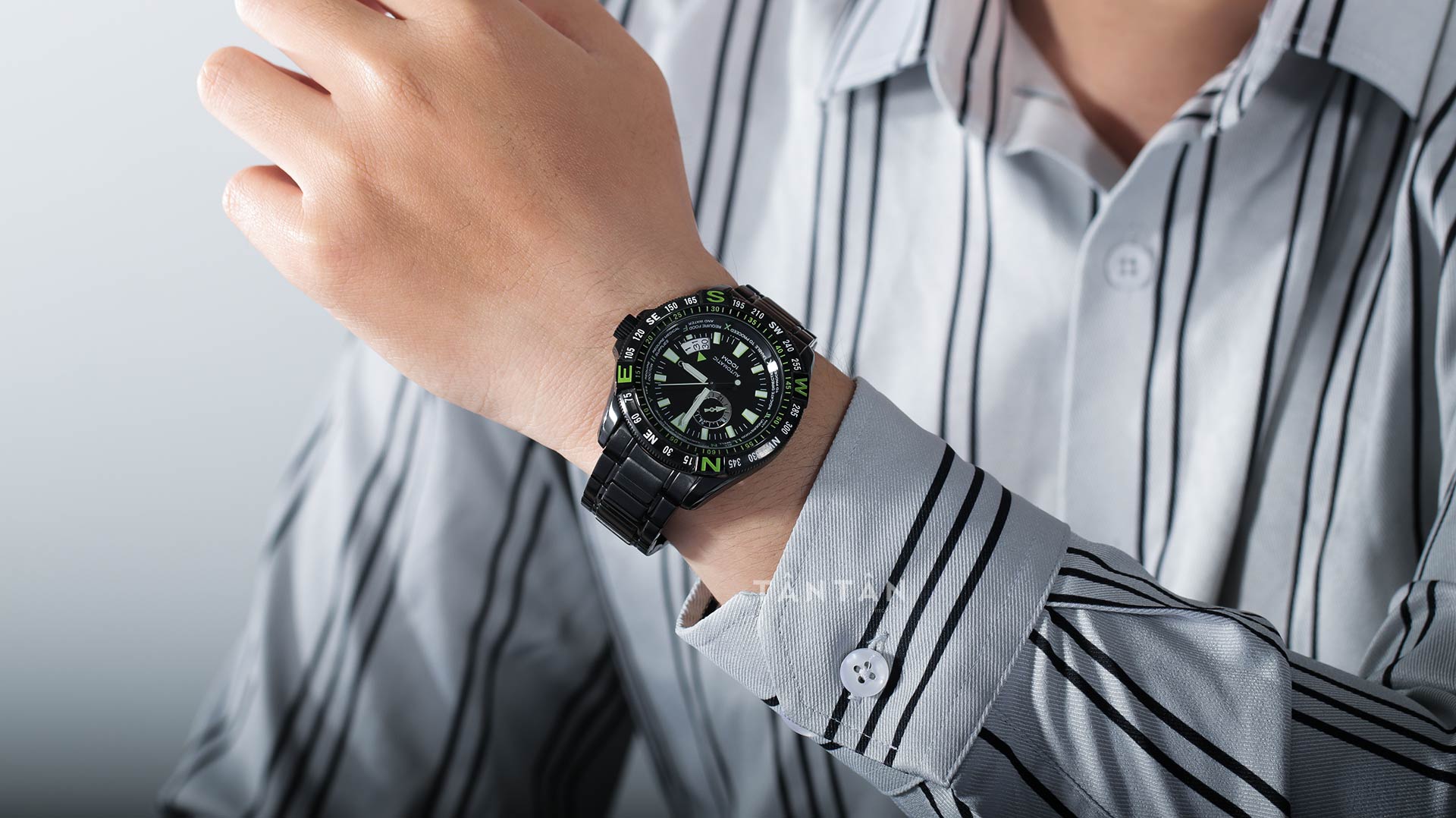 Mặt số màu đen với các chi tiết xanh lá nổi bật, trang bị giờ 24, vòng lịch ngày, dạ quang mang phong cách thể thao mạnh mẽ
