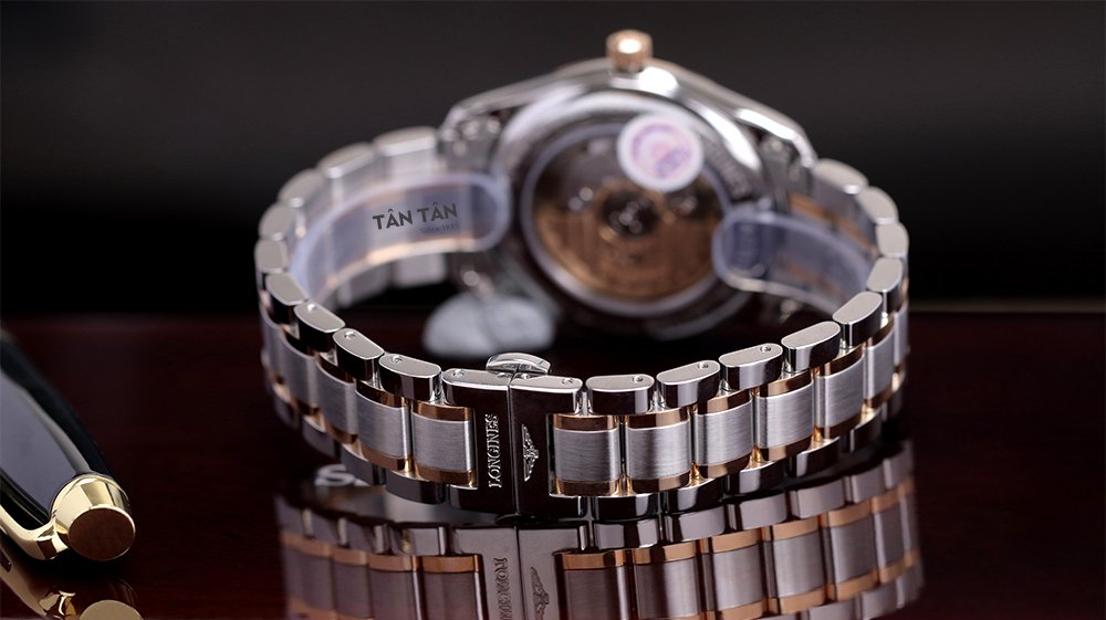 Bên cạnh đó, dây đeo của Longines L2.793.5.57.7 được hoàn thiện từ chất liệu thép không gỉ cao cấp, vật liệu làm nên những mẫu Longines dây kim loại trứ danh. Các mắt kim loại bạc được đánh bóng hoàn hảo, đan xen liên kết giữa được hoàn thiện phay xước và bọc vàng hồng 18K dày 200 micron dọc 2 đường tạo hiệu ứng demi lộng lẫy, chuyển sáng cực kỳ bắt mắt và tôn da khi đeo lên tay. Đi kèm là khóa đôi được thiết kế chốt gấp ba lần an toàn và mở theo cơ chế đẩy tiện lợi, tháo ra và lắp vào dễ dàng, giúp các quý ông dễ dàng tháo ra và lắp vào trong quá trình sử dụng.