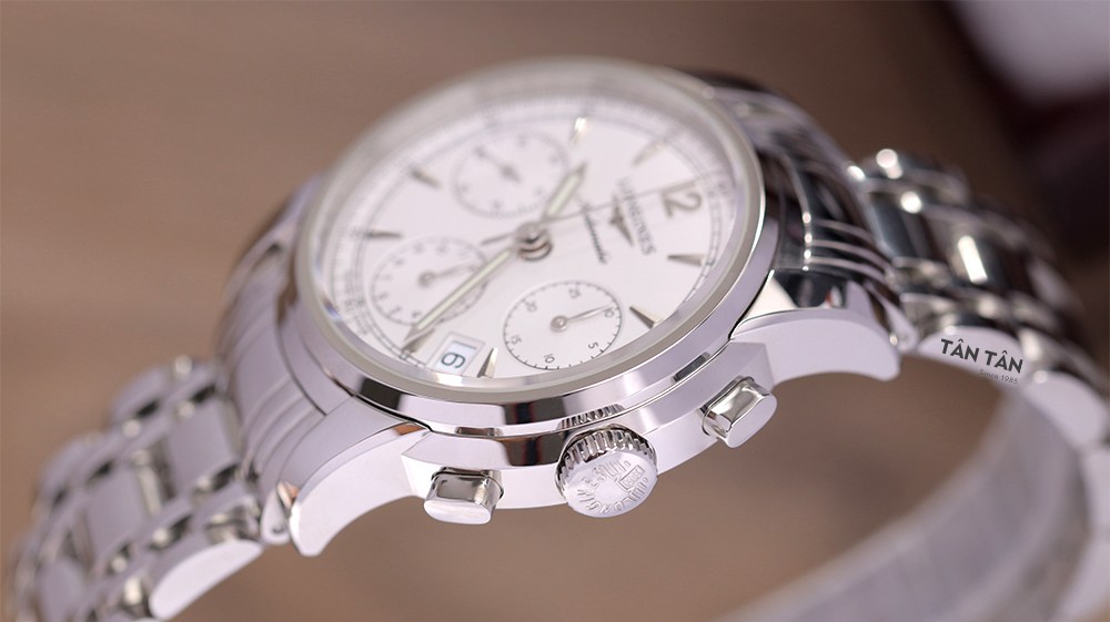 Gắn với bộ vỏ chắc chắn là 2 nút chức năng chronograph đặt tại vị trí 2-4 giờ quen thuộc. Núm chỉnh giờ được ở giữa tại vị trí 3 giờ có khắc tên Longines mang đậm dấu ấn thương hiệu.