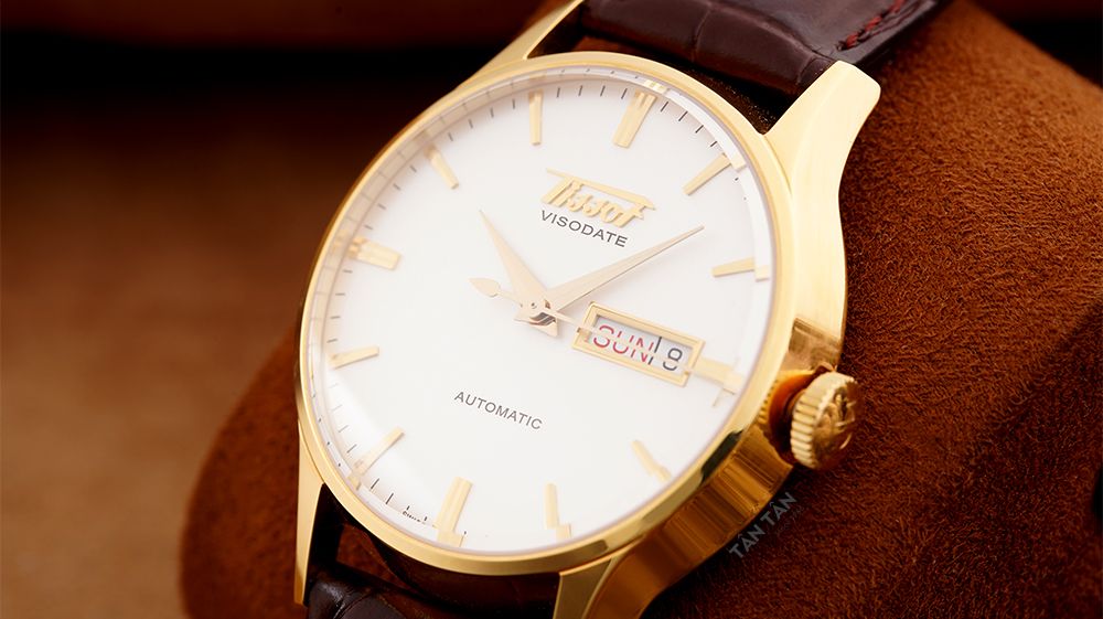 Dòng chữ logo Tissot được thiết kế nổi bật, màu vàng gold đặt tại vị trí góc 12 giờ với những đường nét trau chuốt đầy tinh tế, nét ngang chữ “T” kéo dài bao quát toàn bộ tên thương hiệu thể hiện sự phát triển không ngừng của một tên tuổi đình đám đến từ Thụy Sĩ và ngay dưới tên thương hiệu là dòng chữ “Visodate” định danh bộ sưu tập.