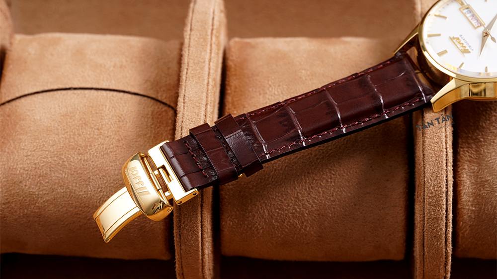 Dây đeo đồng hồ Tissot T019.430.36.031.01 sử dụng chất da cao cấp thuộc nâu đồng điệu tổng thể thiết kế. Dây đeo thiết kế 2 lớp được may chắc chắn dọc viền dây bằng chỉ đen với bề mặt dập vân lớn cá sấu sang trọng, lớp trong mềm mại hơn nhẹ tràng trên cổ tay. Thêm vào đó, bằng việc kết hợp dây đeo da sẽ mang đến phong cách thời trang ấn tượng, làm nổi bật sự sang trọng, trang nhã cho người đeo. Đi kèm với dây da là khóa gập cân bằng giúp hạn chế gãy, hư dây trong quá trình đeo vào - tháo ra. Đây cũng là loại khóa thường thấy ở những mẫu đồng hồ dây da cao cấp được Tissot và các thương hiệu đồng hồ ứng dụng vào thiết kế của mình.