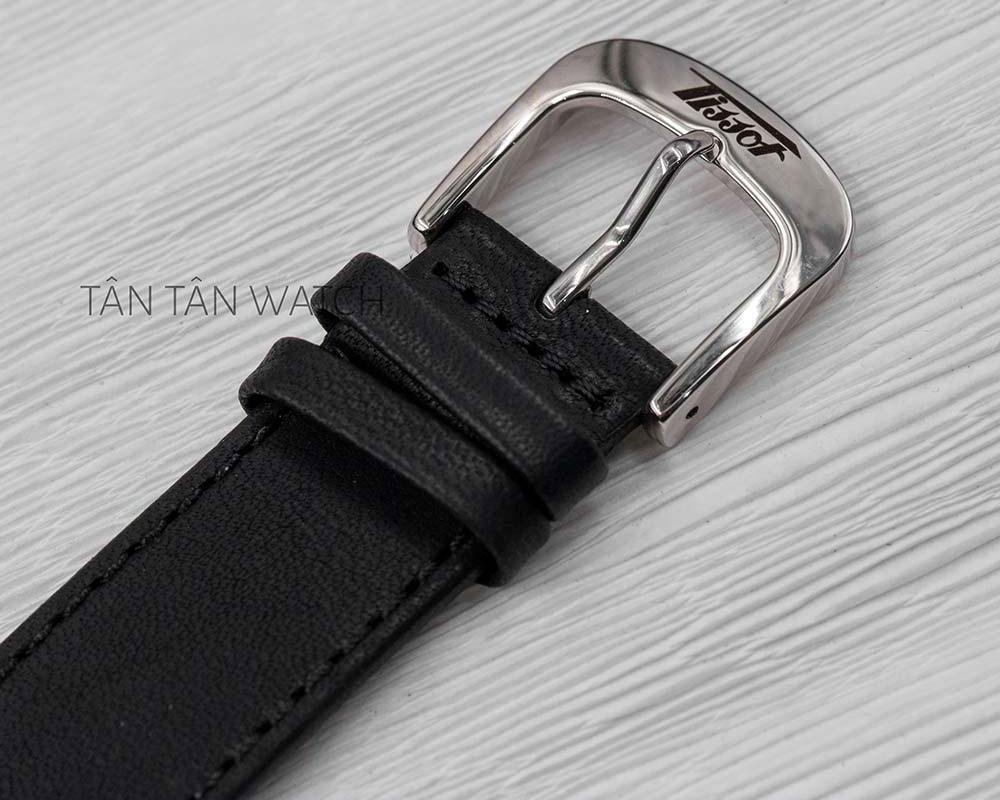 Dây đeo đồng hồ Tissot T118.410.16.057.01 được làm bằng chất da bê cao cấp, nhẹ nhàng trên cổ tay. Dây da thuộc đen cùng tông với tổng thể mặt số được may chắc chắn bằng đường chỉ tiệp màu dọc viền dây mang đến nét thẩm mỹ cùng thời gian sử dụng bền lâu. Chất da sẽ mang đến phong cách thời trang ấn tượng, làm nổi bật sự sang trọng, trang nhã cho người đeo. Đi kèm với dây da là khóa cài tiện lợi dễ dàng đeo vào-tháo ra, cố định chắc chắn trên cổ tay không bị rơi trong các hoạt động mạnh.