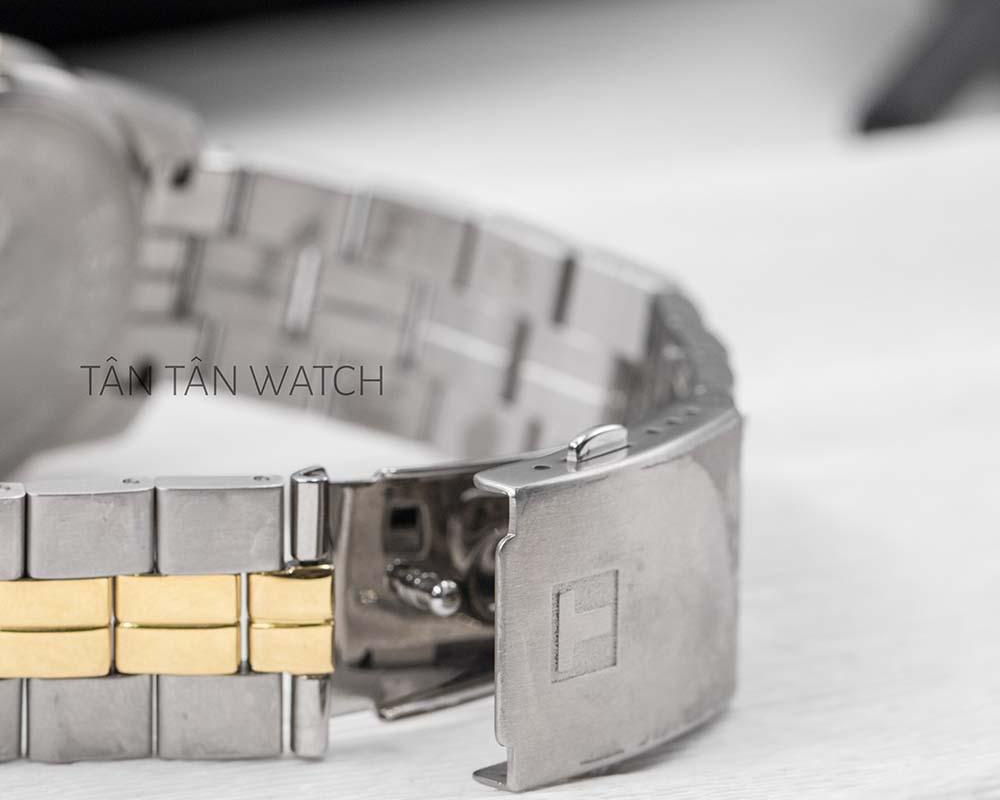 Với chất liệu thép không gỉ 316L, mẫu dây đeo này không thấm nước, mồ hôi nên không gây ra mùi khó chịu cho dù các quý ông đeo trong khoảng thời gian dài. Đồng hồ còn được trang bị khóa gập tiện lợi dễ dàng tháo ra và đeo vào. Trên bề mặt khóa có logo Tissot khẳng định giá trị thương hiệu trong thiết kế.