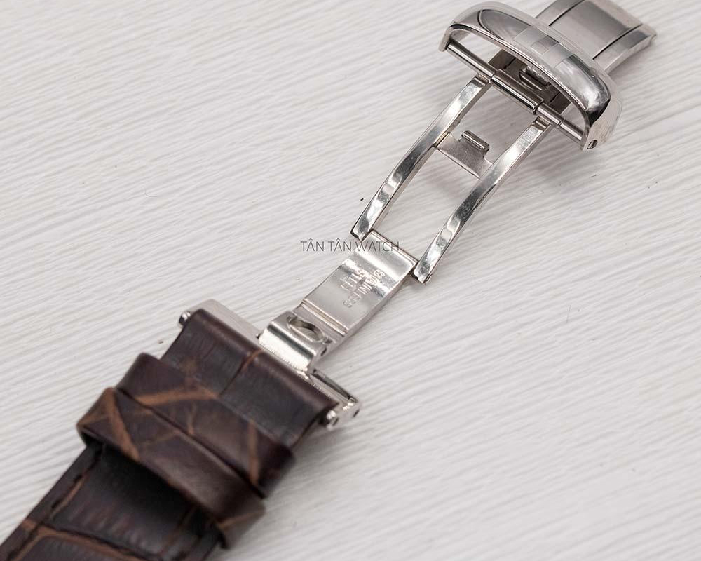 Là mẫu đồng hồ cao cấp cho các chàng yêu thích phong cách quý ông, nam tính, Tissot T055.410.16.037.00 lựa chọn dây đeo với chế tác bằng chất da cao cấp, mềm mại kết hợp tông màu nâu lịch lãm thể hiện phong cách thời trang ấn tượng. Thiết kế dây đeo 2 lớp được may chắc chắn dọc viền bằng chỉ nâu cùng tông, bề mặt dập vân cá sấu tự nhiên, tinh tế tạo nên tổng thể vừa trẻ trung, vừa sang trọng. Đi kèm dây da là khóa bướm giúp hạn chế gập gãy, hư da dây trong quá trình đeo vào - tháo ra, kéo dài tuổi thọ dây da.