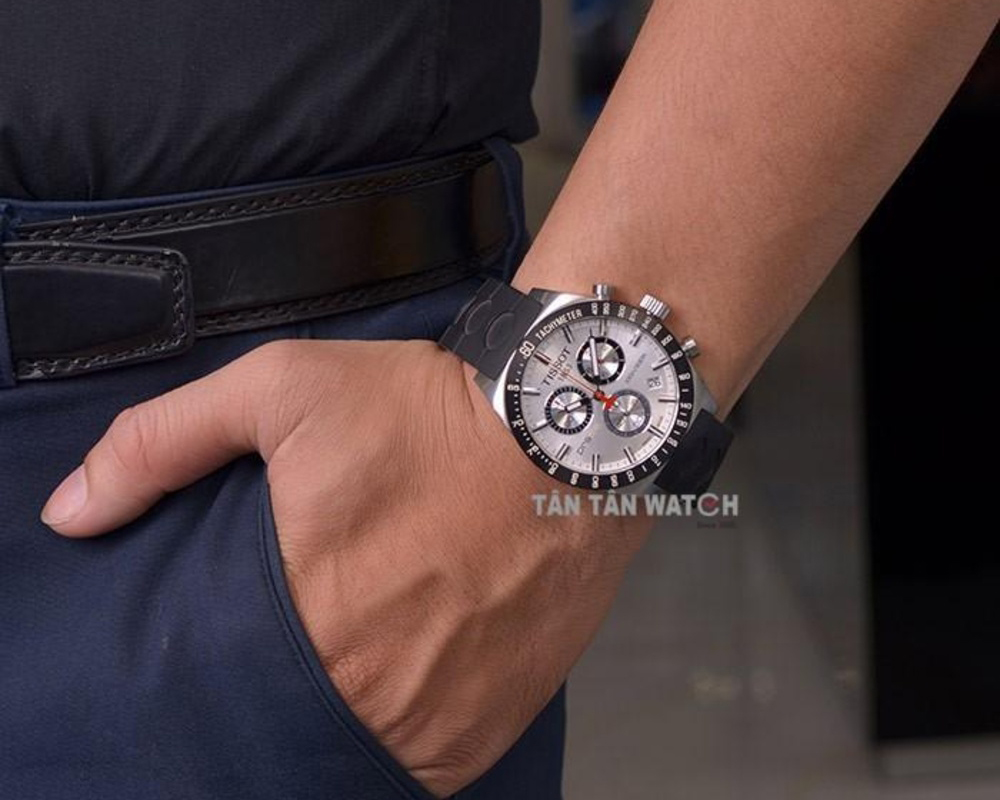 Theo thứ tự từ ngoài vào, vành bezel lớn màu đen đóng vai trò là thang đo tốc độ Tachymeter. Trên đó, các cột mốc phân chia được thông tin rất rõ ràng, màu mực trắng nổi bật trên nền đen thu hút. Chức năng này dùng để đo tốc độ di chuyển nếu đã biết khoảng cách giữa 2 mốc, hoặc ngược lại, tính khoảng cách nếu di chuyển với tốc độ đều. Kế đến, viền ngoài đồng hồ Tissot (chapter ring) thể hiện các cột chia giờ to bản và nổi bật, xen giữa là các vạch chia phút. Để làm nổi bật kim chỉ phút, nhà chế tác đã khéo léo đặt chúng lên nền trắng, vừa dễ quan sát, vừa là điểm nhấn tạo hiệu ứng thẩm mỹ. Đồng thời ăn khớp cùng các vạch chỉ giờ và bộ kim to bản khối vuông được phủ dạ quang gần như toàn bộ bề mặt.