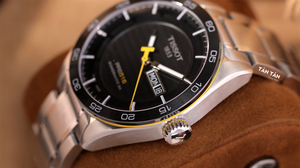 Ở cạnh phải là núm chỉnh dạng nắp chai to bản được đánh bóng sắc sảo với các đường khía rãnh bánh răng và logo chữ T đặc trưng của Tissot được khắc nổi trên bề mặt núm. Niềng bezel có thiết kế dày dặn bằng ceramic và mạ ion đen, được đánh thớ mờ tỉ mỉ đồng bộ với bộ vỏ tạo nên một tổng thể thiết kế phong trần và nam tính. Giữa niềng bezel ceramic và bộ vỏ thép không gỉ là dây ron bằng cao su màu vàng chanh điểm xuyết cho tổng thể và giúp liên kết giữa 2 phần này mượt mà tạo thành 1 khối kín bảo vệ tốt bộ máy bên trong. Với đường kính vỏ 42mm, mẫu đồng hồ này sẽ phù hợp cho cổ tay từ 16cm cùng độ chống nước 10ATM hỗ trợ tham gia các hoạt động dưới nước.