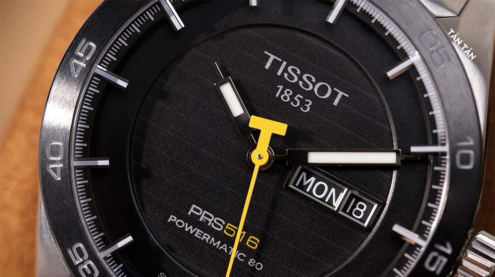 Mặt số của Tissot T100.430.11.051.00 sở hữu một thiết kế rất khác biệt với những chi tiết độc đáo được sắp xếp và phân bổ cân đối, hài hòa tạo nên một tổng thể cực kỳ nổi bật. Ở góc 12 giờ là tên thương hiệu và năm thành lập, góc 6 giờ là tên dòng sản phẩm PRS 516 cùng ký hiệu Powermatic 80 trứ danh, góc 3 giờ là lịch thứ-ngày được đặt gọn gàng trong khung thép, to rõ rất thuận tiện khi quan sát.