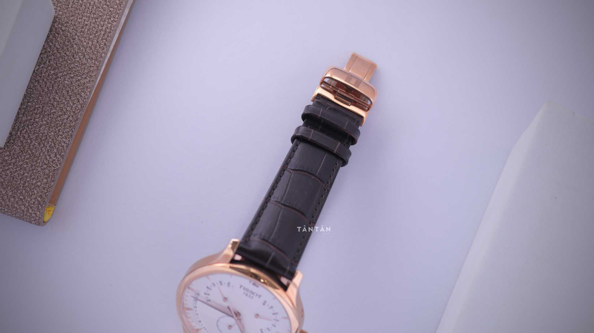 Kết hợp cùng theo đó là khóa cân bằng thường thấy trên những mẫu đồng hồ Tissot nam dây da cao cấp. Điểm mạnh của khóa cân bằng là sự gọn gàng, chắc chắn giúp bộ dây đeo ôm trọn lấy cổ tay. Thêm vào đó, mặt khóa cũng được cắt gọt với những đường cong mềm mại và khắc chìm logo chữ T đầy tinh tế.