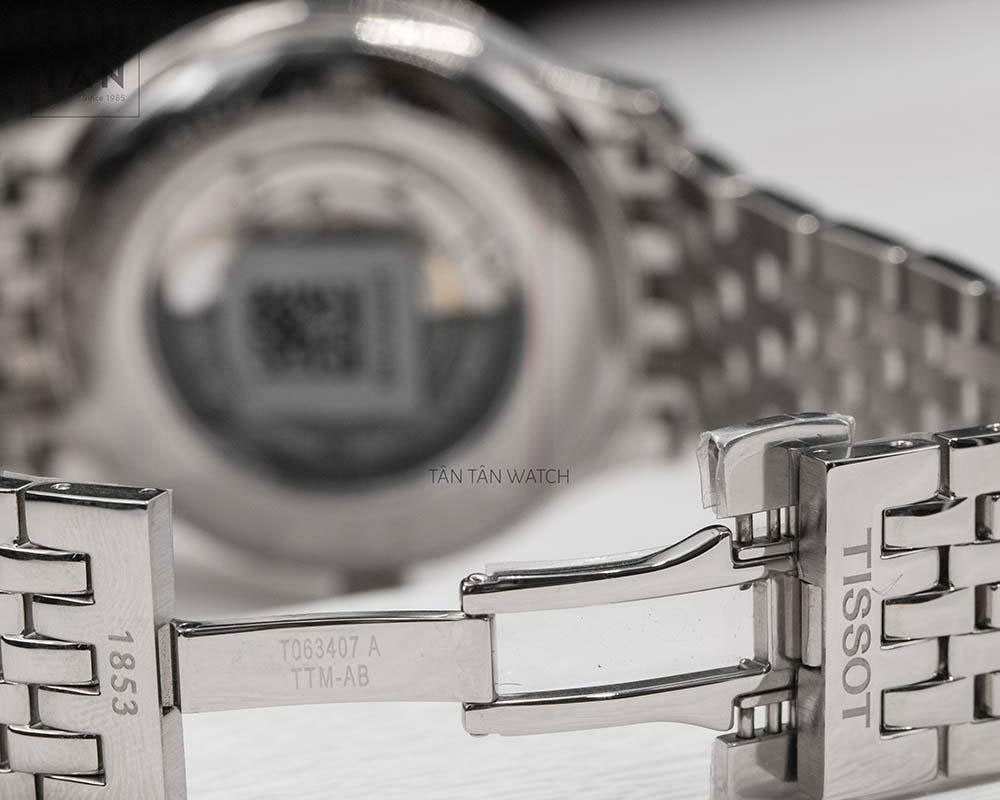 Tissot T063.907.11.058.00 được trang bị bộ dây thép không gỉ được hoàn thiện bề mặt sáng bóng đậm nét cổ điển và sang trọng. Thiết kế 7 mắt xích liên kết chặt chẽ với nhau, uyển chuyển và ôm trọn cổ tay cùng chất liệu cứng cáp, bền chắc trước va đập mang đến thời gian sử dụng dài lâu. Đi kèm theo thiết kế dây này là khóa gập cân bằng gọn gàng giúp dây đeo liền lạc hơn, kết hợp nút bấm tiện lợi dễ dàng tháo-mở, cố định trên cổ tay không bị bung ra khi vận động mạnh. Thêm vào đó, mặt khóa cũng được cắt gọt với những đường cong mềm mại và khắc chìm “Tissot 1853” đầy tinh tế.