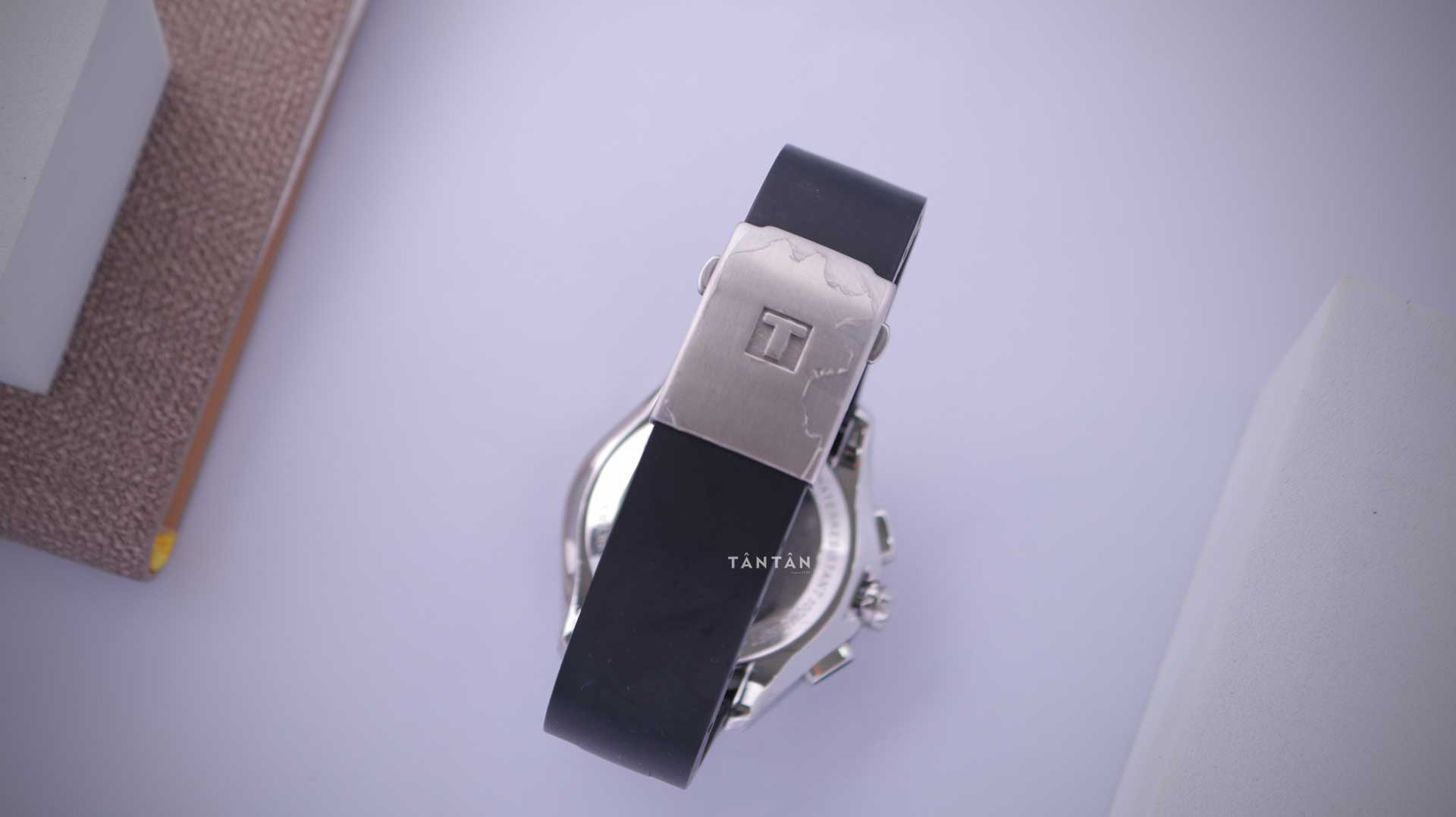 Gắn liền với bộ vỏ chắc chắn là dây đeo cao su đen chống thấm nước. Dây đeo này có kết cấu nhẹ và không bị gãy bởi cách dập vân bên trong nên các chàng có thể thoải mái vận động dưới nước mà không lo khó chịu khi dây đeo bị thấm nước như dây da hay lâu khô như dây kim loại nhiều mắc xích. Đi kèm dây cao su là khóa gập chắc chắn với nút bấm tiện lợi, đây là loại khóa an toàn bậc nhất được sử dụng ở những mẫu đồng hồ Tissot dây cao su, giúp dây đeo không bị bung rời khi vận động mạnh hoặc lặn sâu.
