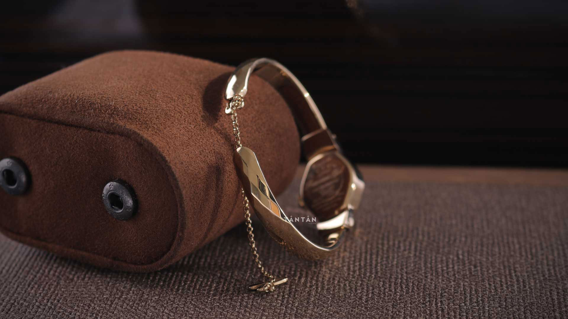 ✓ Bề mặt vỏ vay dây đeo hoàn thiện vân caro độc đáo phủ màu vàng gold tổng thể.