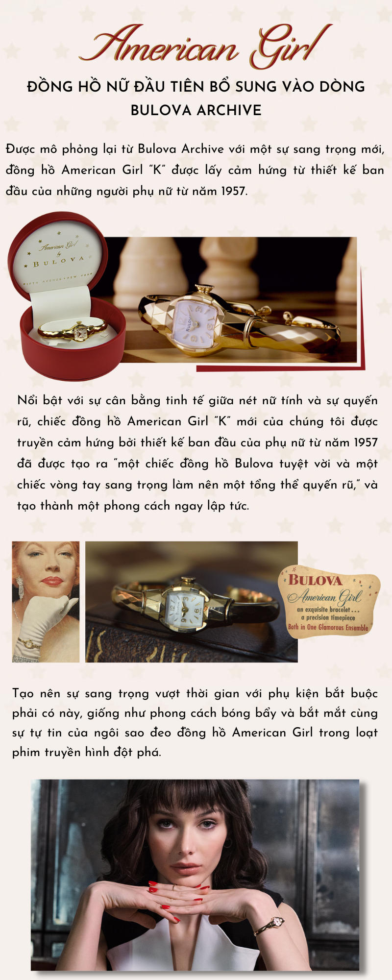 Nổi bật với sự cân bằng tinh tế giữa nét nữ tính và sự quyến rũ mạnh mẽ, Bulova American Girl "K" được lấy cảm hứng từ thiết kế ban đầu dành cho phụ nữ từ năm 1957. Chiếc đồng hồ Bulova 97L170 tuyệt vời như là chiếc vòng tay lộng lẫy trong một bộ quần áo sang trọng và đã trở thành một trào lưu phong cách ngay lập tức. Đây là một món quà tuyệt vời cho các chị em yêu thích phong cách sang trọng, quý phái.